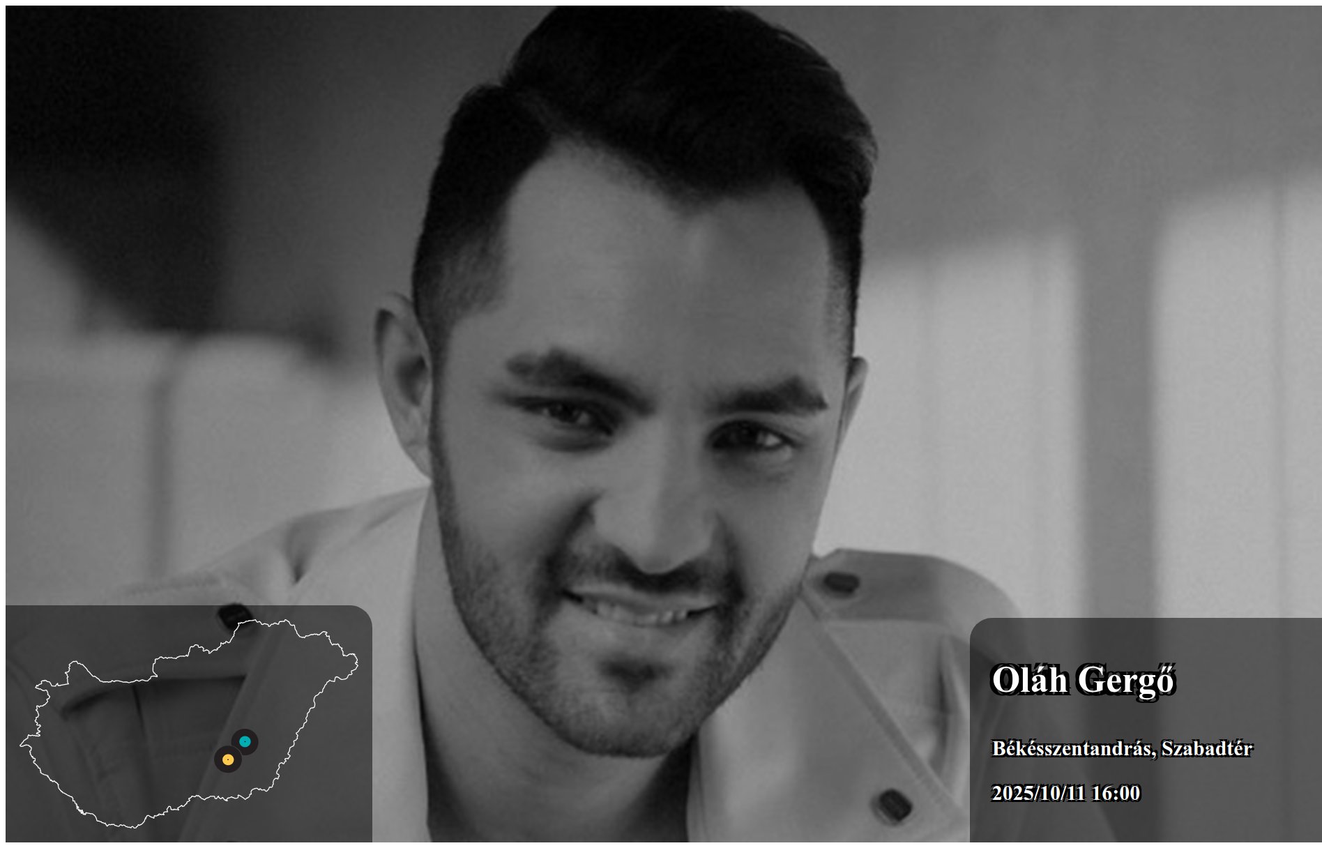 Az itt megjelenő eseményeket a produkció, vagy annak képviselője rögzítette. Az oldalon lévő információk valódiságáért a Koncertbooking.com ennek kapcsán felelősséget nem tud vállalni. Indulás előtt ellenőrizze az adott település vagy eseményhelyszín oldalán is a rendezvény paramétereit.
